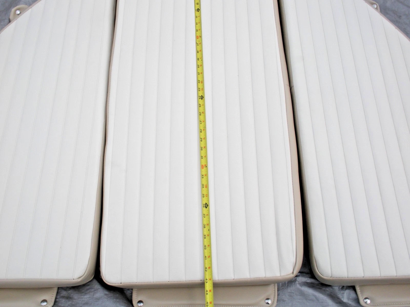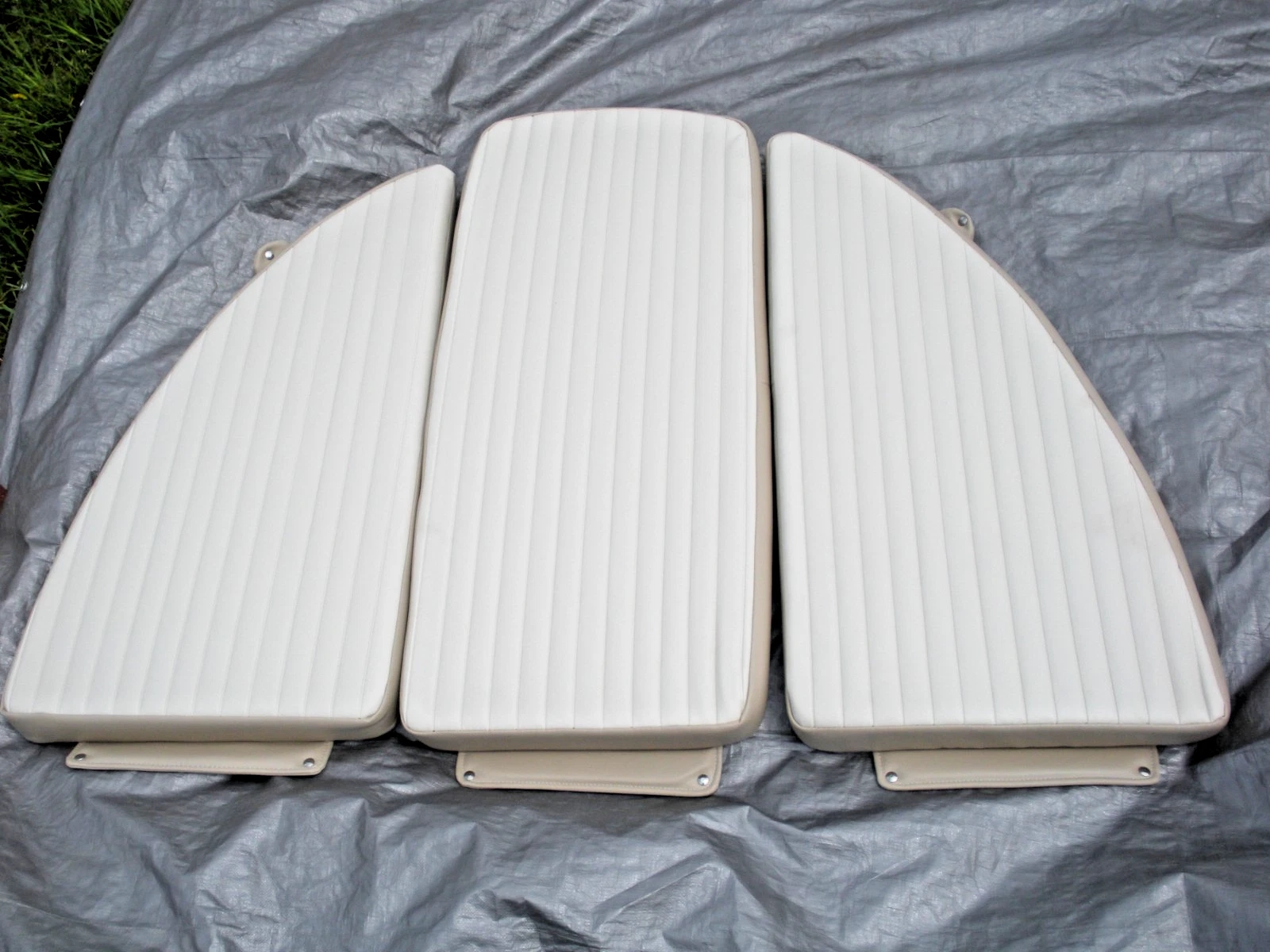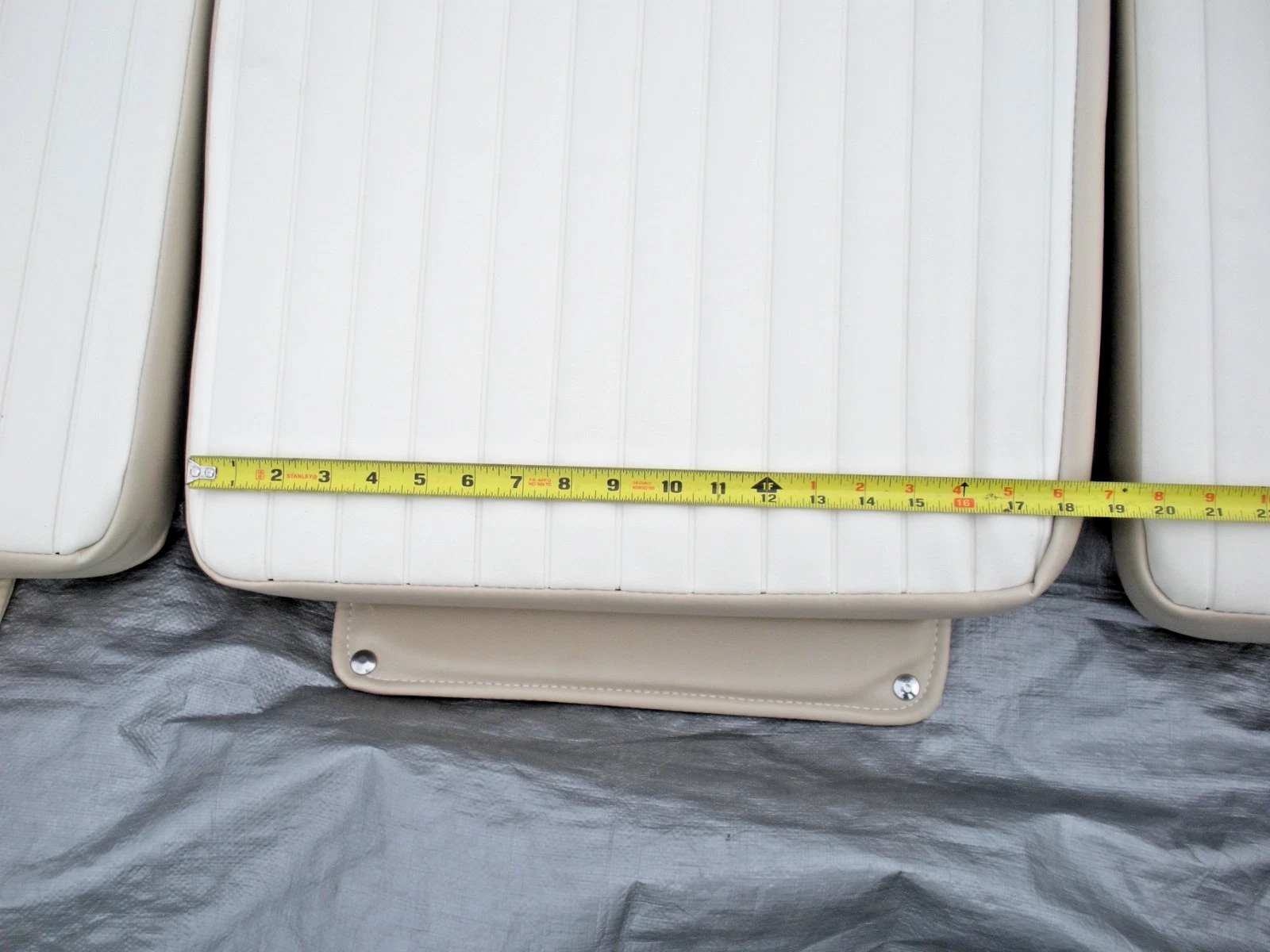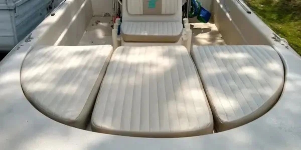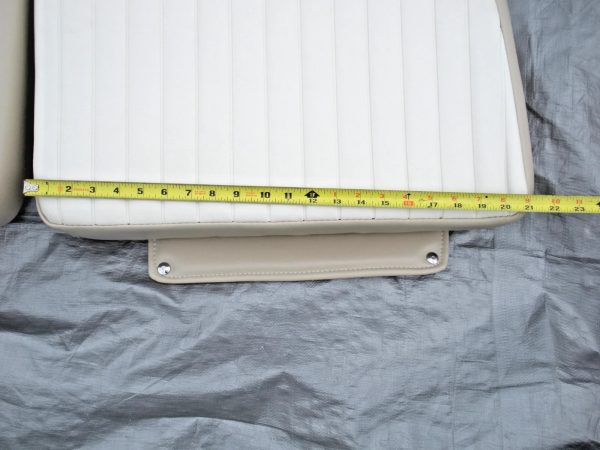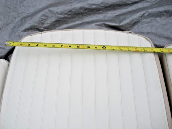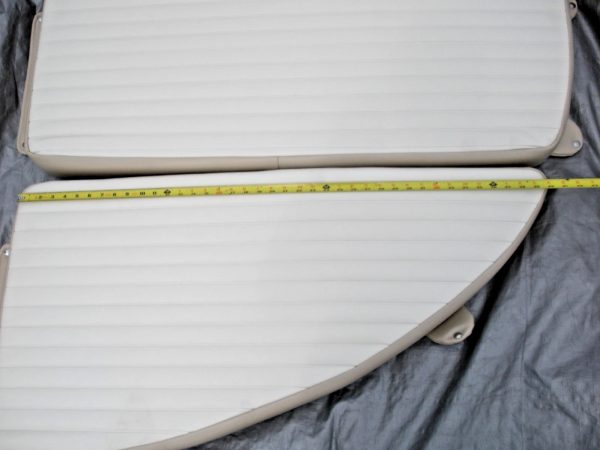 Carolina Skiff JVX 3 piece bow cushion set. This cushion set was obtained by a closed Carolina Skiff dealer. There are no part numbers on the cushions. They are believed to fit JVX 16, 18 and 20 models but the exact boat models that they fit is unknown. The colors are chalk white and tan. The basic measurements of the center cushion approximately 43″ long as measured down the center and 18″ wide. The side cushions are 40″ long measured on the inner edge and are 21″ wide at the aft edge. All cushions are 3″ thick. Please look at the photos carefully and compare the measurements to determine if this is correct for your application. Although these cushions are listed as used, they may be new old stock. But because there are no identifying tags, are not in original packaging and are slightly soiled from storage they are being sold as used. Please ask questions before ordering because this cushion set is being sold as-is and is not returnable. 2-0910P