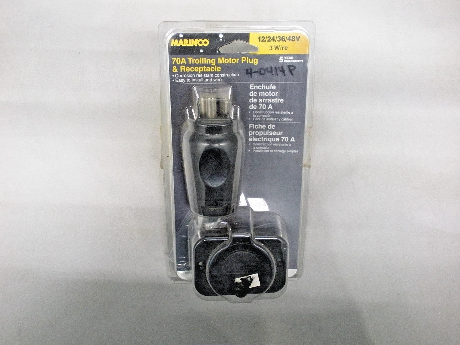 Marinco 70A trolling motor plug and receptacle. 12/24/36/48 volt, 3 wire. New old stock item in original packaging. 4-0414P