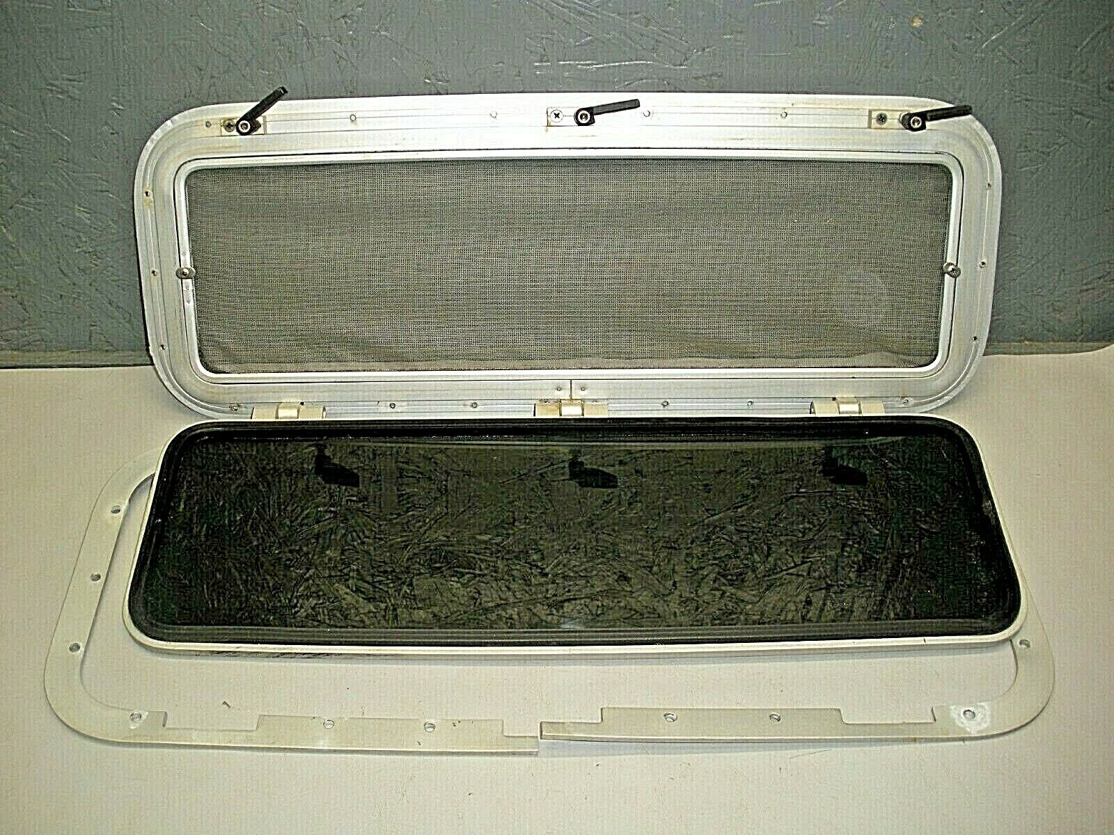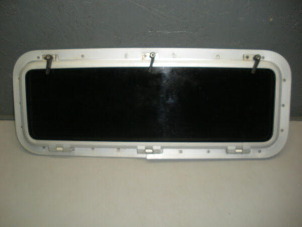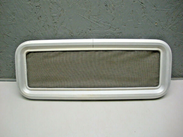 Used Renken 260 Classic aft cabin window assembly. 27 3/8″ X 10 3/8″ outside dimensions. Requires 26 1/2 X 9 3/4″ opening. Extruded aluminum frame with dark plexiglass window. Includes screen and interior trim. Nice condition with good hinge, latches and seal. 2-6821