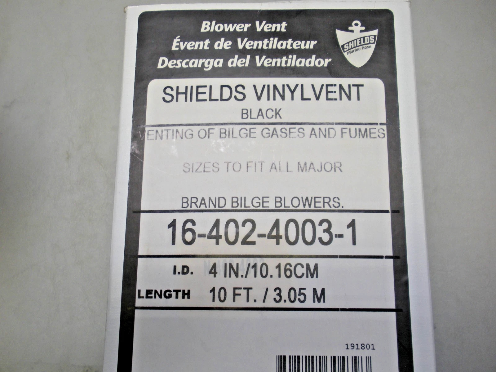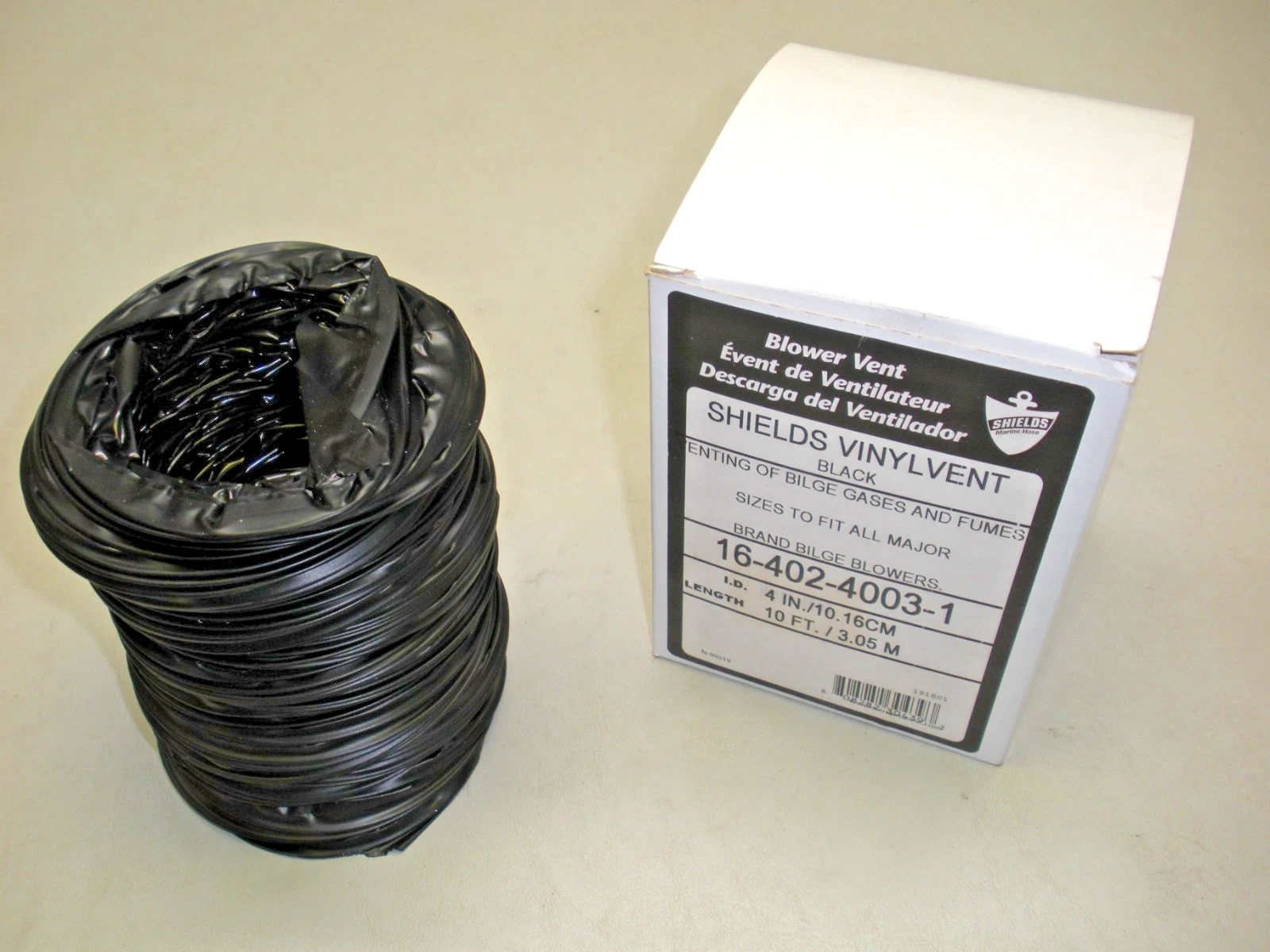 Shields Vinylvent 4″ X 10′ bilge blower hose 16-402-4003-1. New old stock item in original packaging. 8-0884P